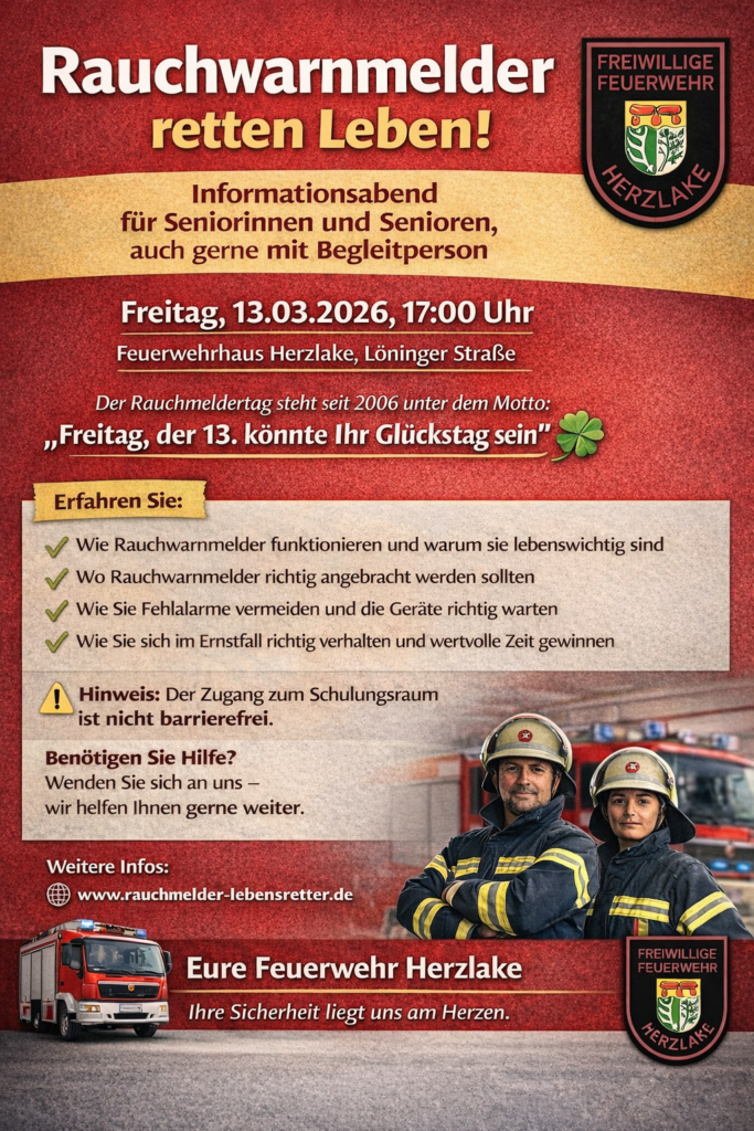Rauchwarnmelder retten Leben! Am Freitag, 13.03.2026 um 17:00 Uhr laden wir alle Seniorinnen und Senioren – auch gerne mit Begleitperson – herzlich zu unserem Informationsabend ins Feuerwehrhaus Herzlake ein. Erfahren Sie, wie Rauchwarnmelder richtig angebracht werden, warum sie lebenswichtig sind und wie Sie sich im Ernstfall richtig verhalten. Der Zugang zum Schulungsraum ist nicht barrierefrei. […]