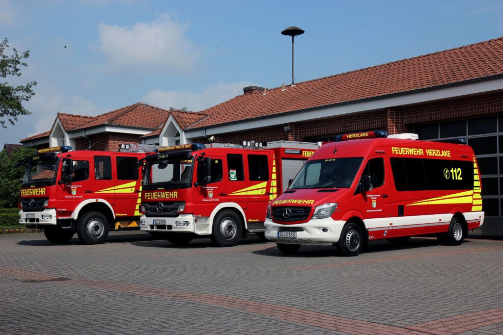 Die Fahrzeuge der Feuerwehr Herzlake vor dem Gerätehaus. Für weitere Infos auf die Bezeichnung der Fahrzeuge unter dem Bild klicken. TLF 20/25 HLF 10/6 ELW 1 Gefahrgutanhänger Mehrzweckanhänger Boot