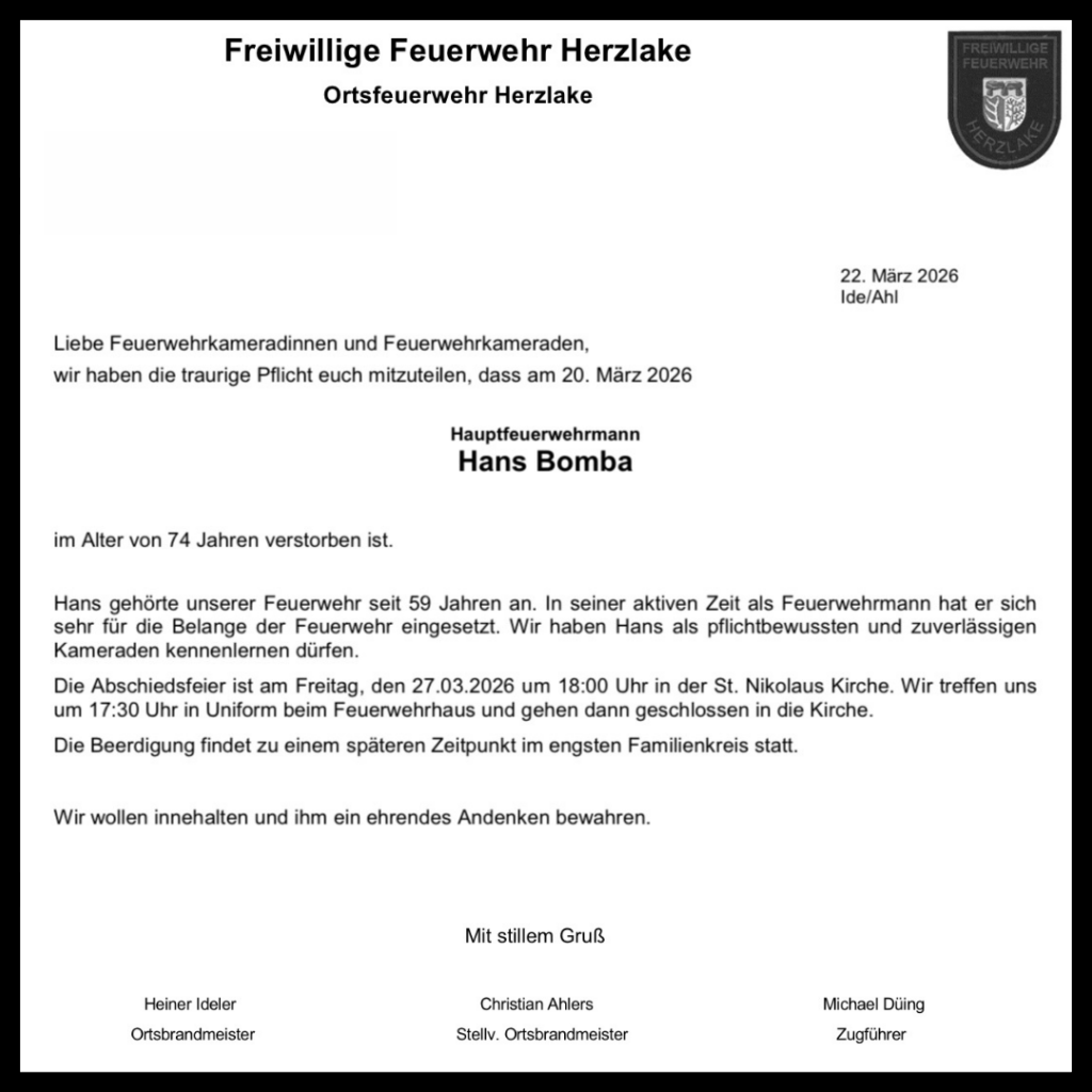 Die Feuerwehr Herzlake trauert um Hans Bomba